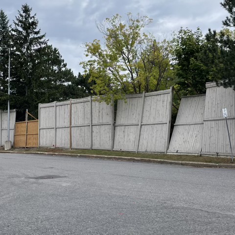 The noise barrier (soundwall) at the back of IKEA in Ottawa, ON, Canada, is broken at several spots.