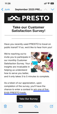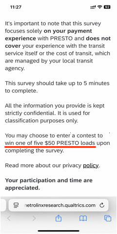 You may choose to enter a contest to win one of five $50 PRESTO loads upon completing the survey. |