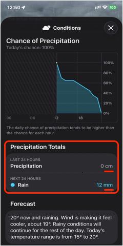 In Weather app (iOS)'s Precipitation Totals section, "Precipitation" uses "cm" as its unit, while "Rain" uses "mm" as its unit. Therefore, "Precipitation: 0 cm" could mean as much as "Rain: 4.9 mm" due to rounding.