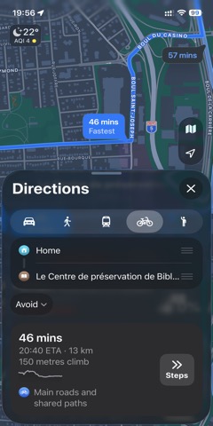 Pour visiter la journée portes ouvertes du Centre de préservation de Bibliothèque et Archives Canada à Gatineau, QC, Canada, j'ai suivi les directions pour vélos indiquées par l'application Apple Maps/Google Maps de mon iPhone.