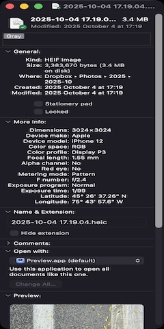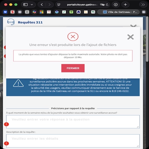 Lors du processus de soumission du formulaire Requêtes 311 en ligne, j'ai sélectionné "Utiliser une photo avec les informations de géolocalisation" pour joindre une photo dans la section "Emplacement de la requête". Le fichier image ne faisait que 3,4 Mo.