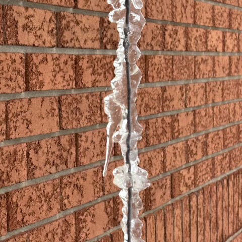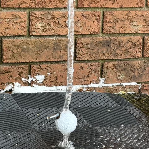 Artificial icicle is slowly building up to become fatter and fatter as ambient temperature hovers around the freezing point of dihydrogen monoxide (H2O) at around 273 K.