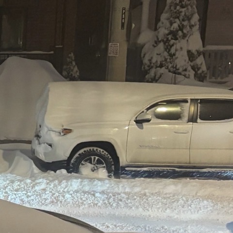 My professional artist daughter Véronique captured snow accumulation on the front of a car in Toronto, ON, Canada. After snow lands, it moves, settles, and redistributes itself until differences in height are reduced. The main mechanism of such equalisation of height is wind redistribution, followed by gravity-driven slumping, compaction and settling, etc.