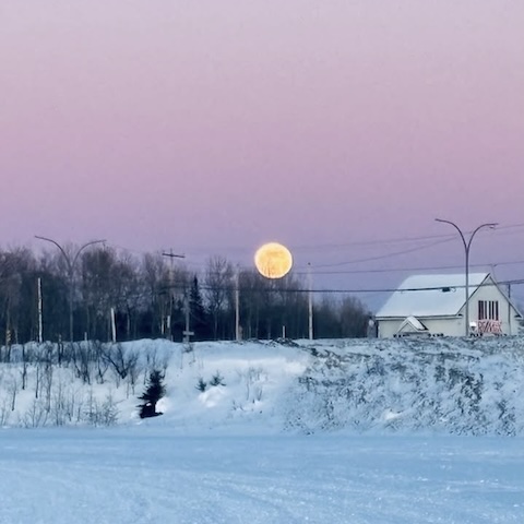 My geological engineer/exploration geologist daughter Évelyne captured this surreal non-AI-generated image with Moon in front of trees and power lines in Baie-Comeau, QC, Canada.