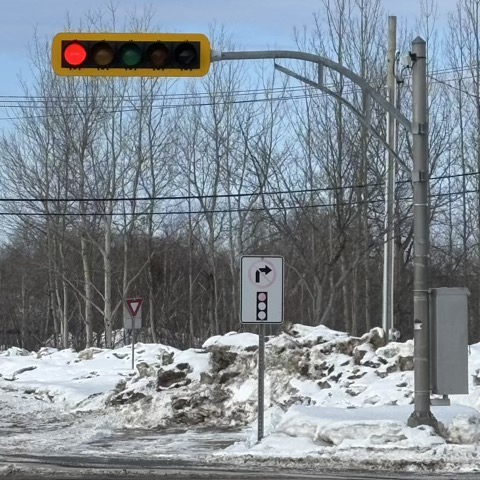 Here is a No-Right-Turn traffic sign in Baie-Comeau, QC, Canada. The RED portion has faded out, so its effectiveness has greatly diminished.