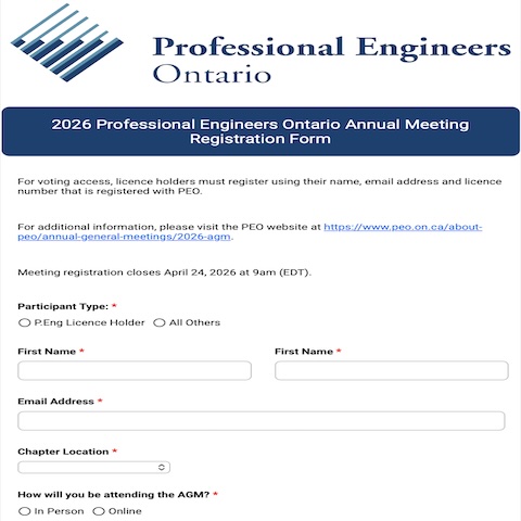 In E-mail message "PEO's 104th Annual General Meeting", clicking button "AGM Registration" leads to "2026 Professional Engineers Ontario Annual Meeting Registration Form" with "First Name" and "First Name".