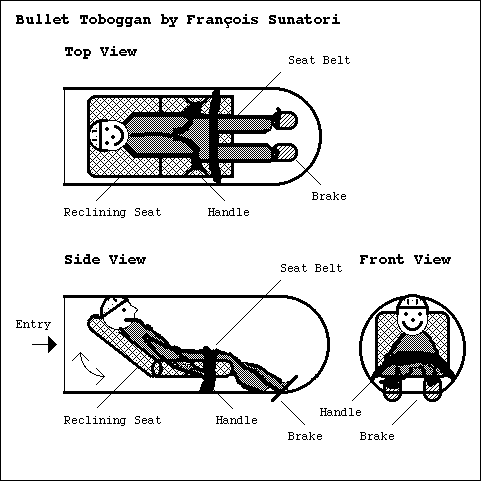 - It is not like an ordinary toboggan but like a bullet. The seat has a comfortable cushion and a belt. It is transparent. You enter from the back and then lift the reclining seat. It can roll and the 2 separate brakes help turn and stop.