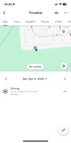 Google Maps Timeline says that I was driving "All day" (1 day 15 hr 12 min) to move 20 m, i.e., hopelessly useless.