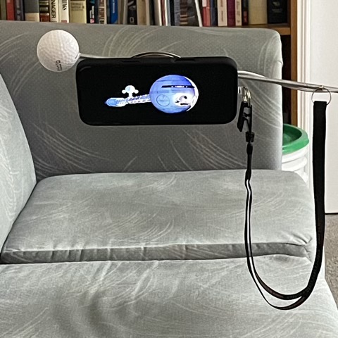 Swingable Magnetically-Supported Bent Steel Bar on a Lamp-Stand for Straight iPhone Viewing on a Sofa with a Golf Ball at the End