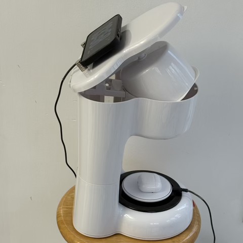 Dual-Orientation iPhone Stand by an Open Coffee Maker