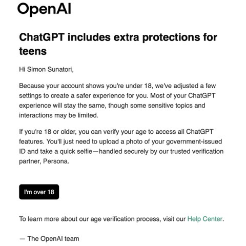 Because your account shows you're under 18, we've adjusted a few settings to create a safer experience for you. Most of your ChatGPT experience will stay the same, though some sensitive topics and interactions may be limited. - The OpenAI team |