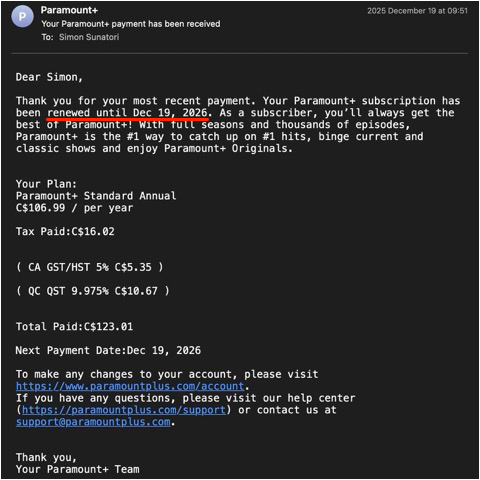| Thank you for contacting Paramount+. On November 4, 2025, we increased the price of our Standard annual plan for new subscribers to $106.99 CAD/year. This increase also applied to existing customers beginning with their next renewal on or after December 4, 2025.