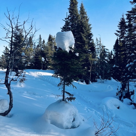 Here are isolated snow accumulation on a tree that looks like a traffic sign on base, captured by my geological engineer/exploration geologist daughter