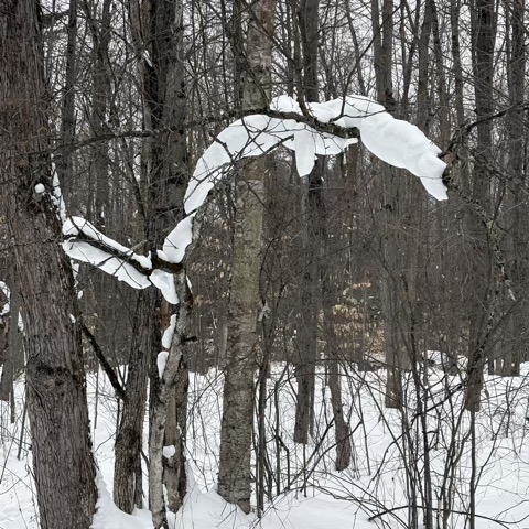 Here is snow accumulated on a tree that looks like flying white dolphin.