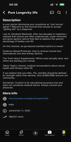 YouTube channel "Pure Longevity life" is hosted by "Dr. Elizabeth Blackwell". The channel's Description states the following.