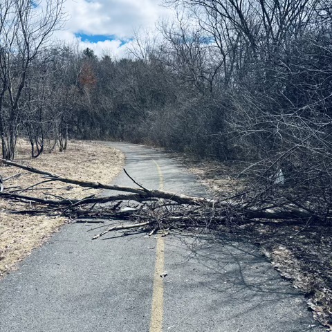 Sur le Sentier des Pionniers, le long du boulevard Allumettières, un arbre tombé bloque le passage. Veuillez le dégager.